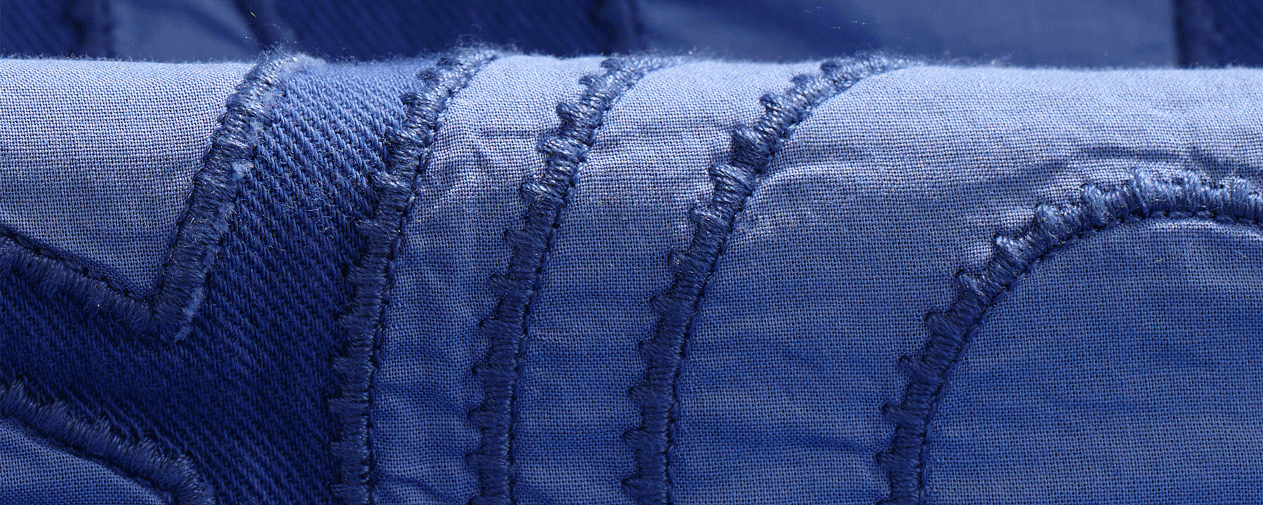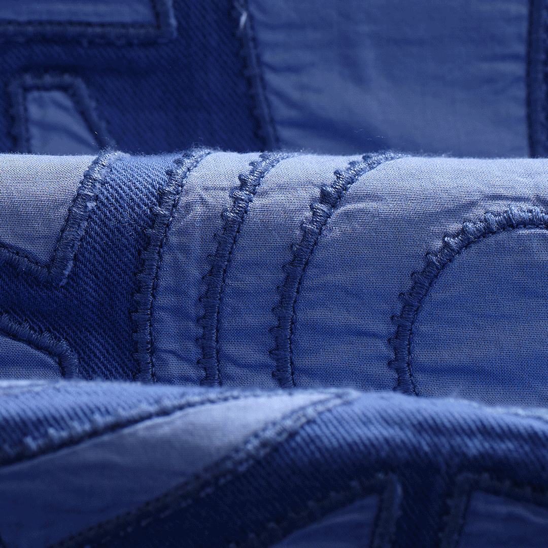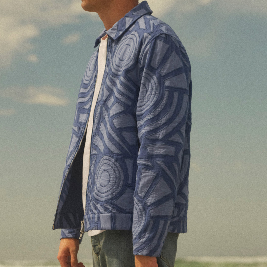 A lightweight layer with a distinctive feel, the Park jacket stands out through its tonal blue palette and bold geometric pattern. The all-over appliqué adds subtle texture and depth, giving the piece a considered, tactile finish.