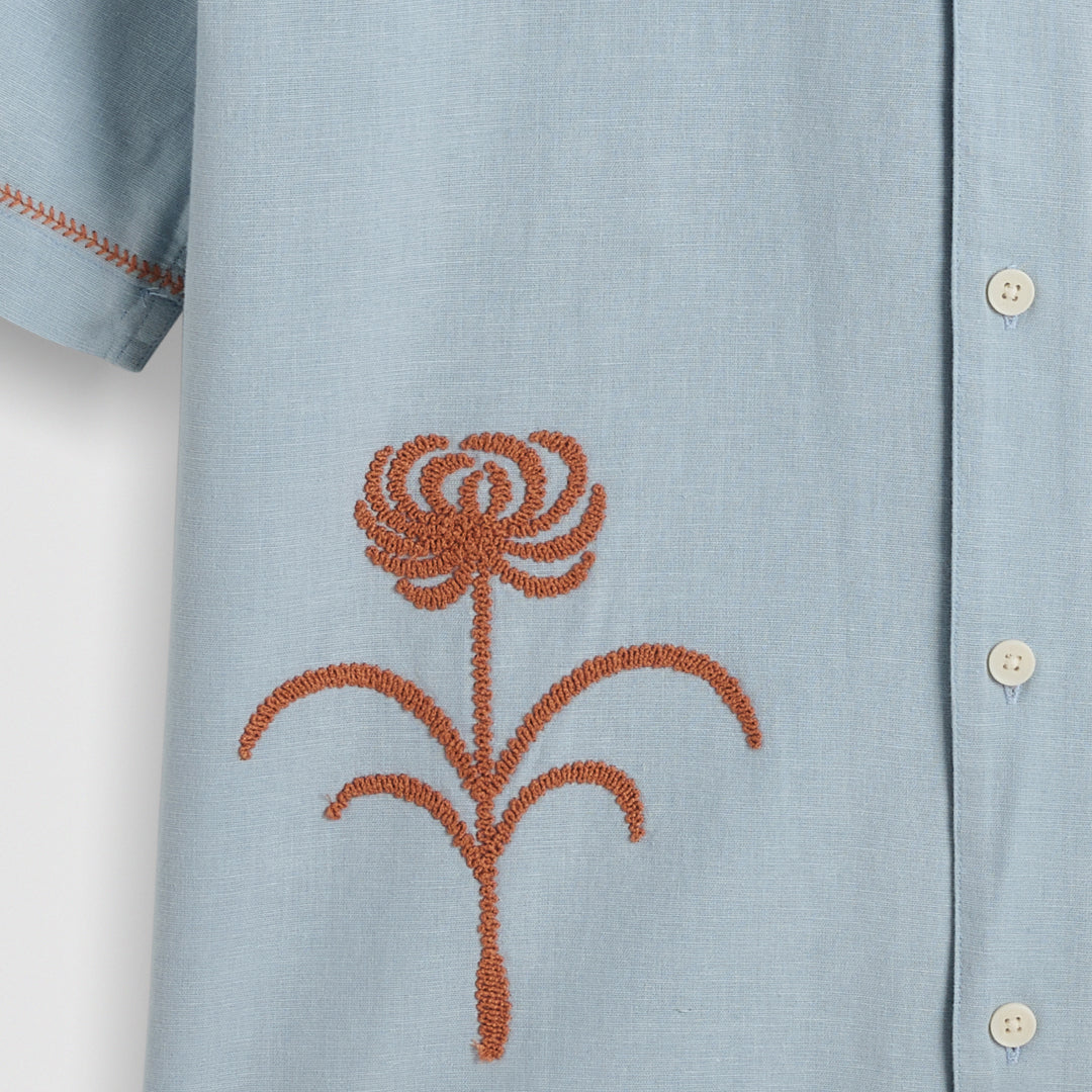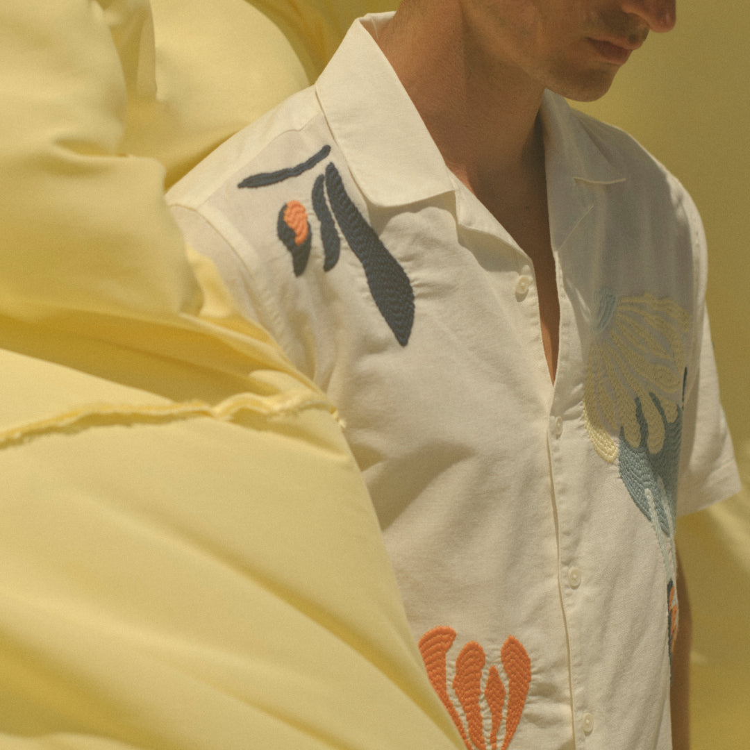 A crisp ecru short-sleeve shirt makes an easy canvas for thoughtful detailing. This Didcot style is lifted by a bold, multicolour botanical motif, brought to life with satin-stitch embroidery - a technique that gives the design its smooth, solid finish and a bit of depth.