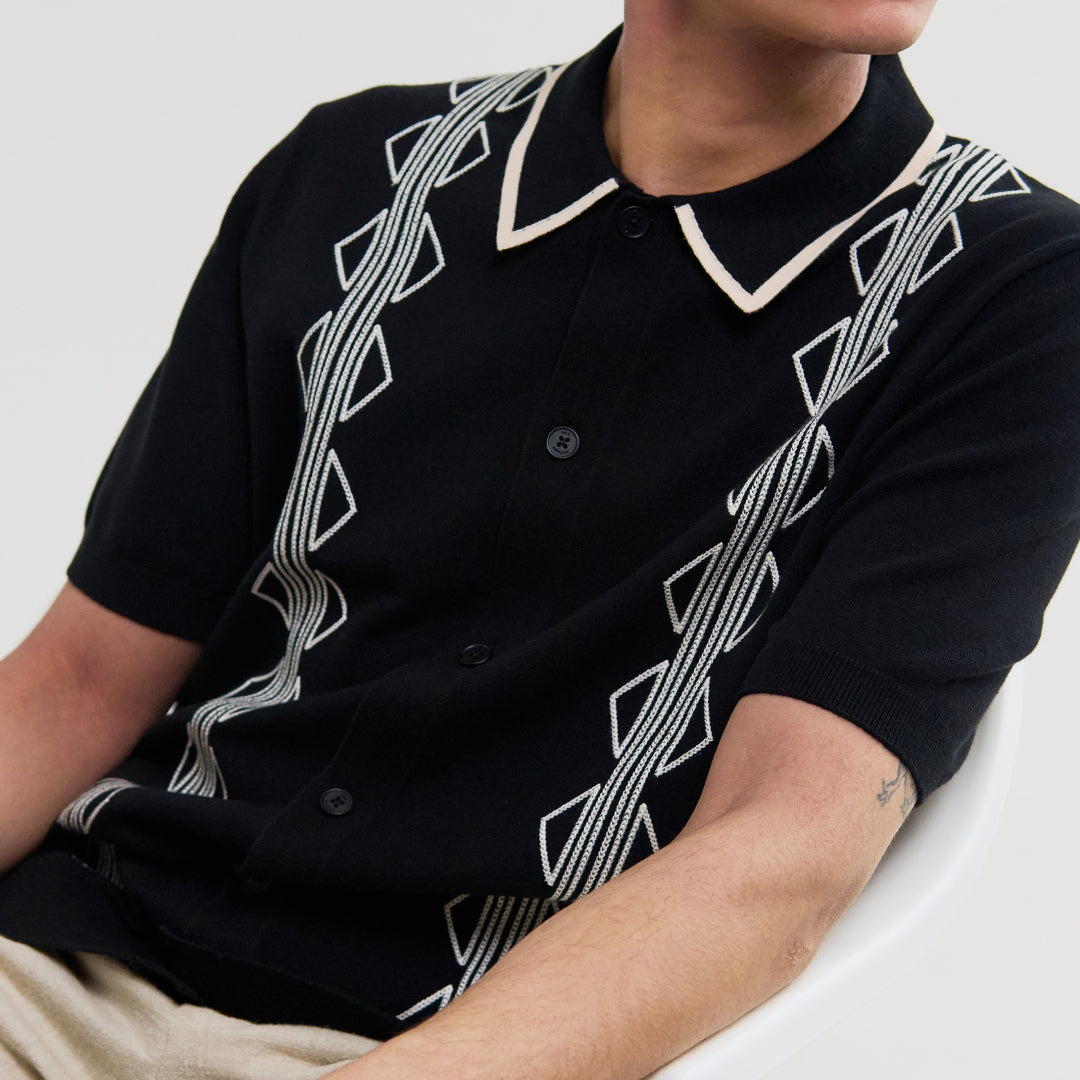 A relaxed take on retro knitwear, the Tellaro shirt updates a classic plain jersey with subtle, considered details. An ecru chain-stitch stripe with triangle accents runs down the front, while gentle tipping at the collar adds a clean, finished touch.