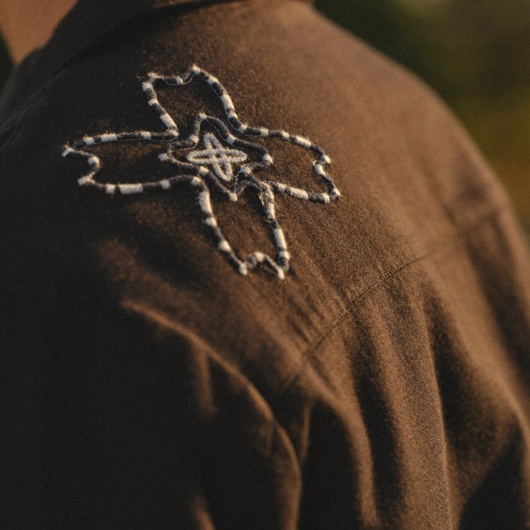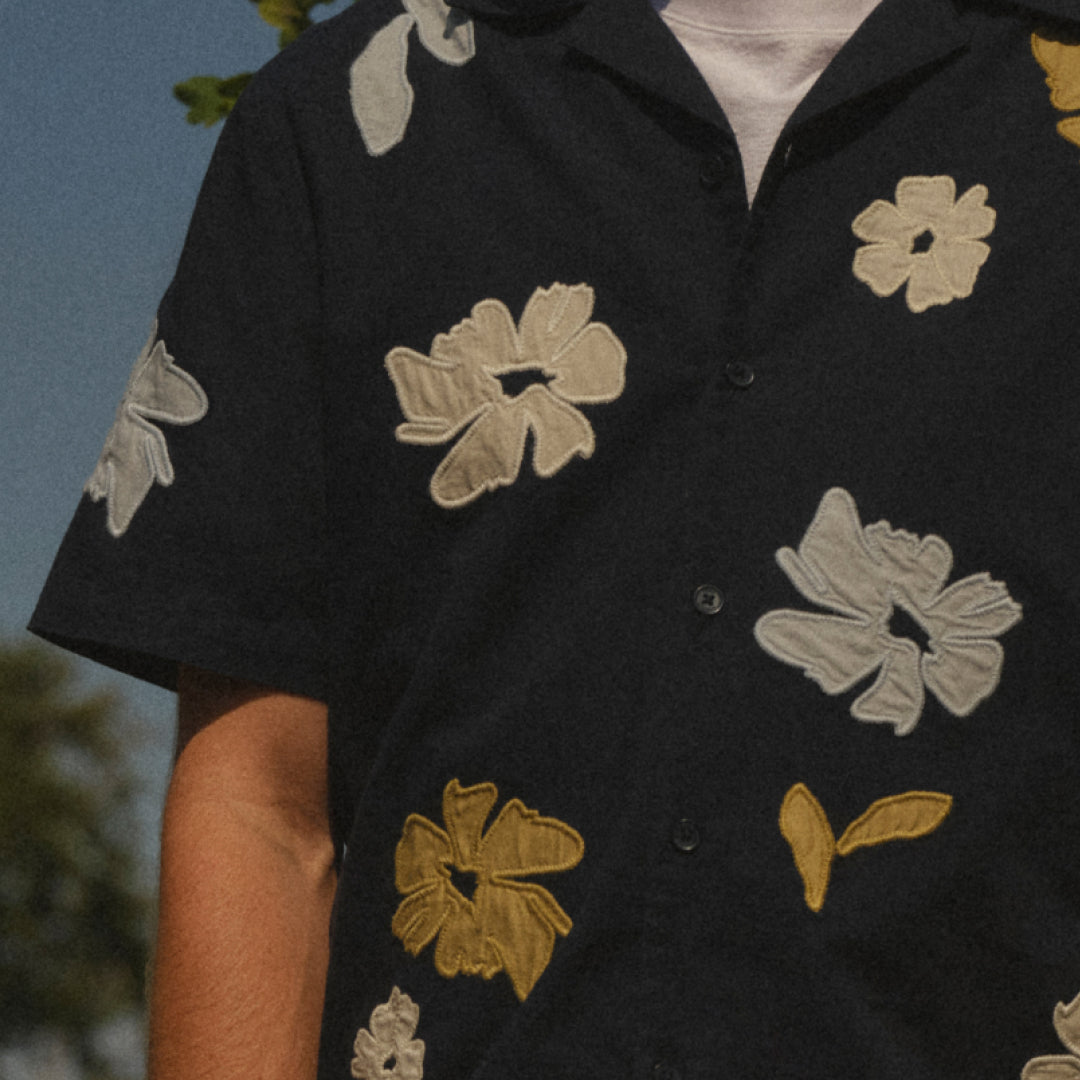 A clean, easy layer with a softer edge, the Eldon jacket is defined by scattered blue and white appliqué flowers that add subtle texture and contrast to its dark base. It’s a good reminder that even more refined pieces can be lifted through thoughtful detailing.