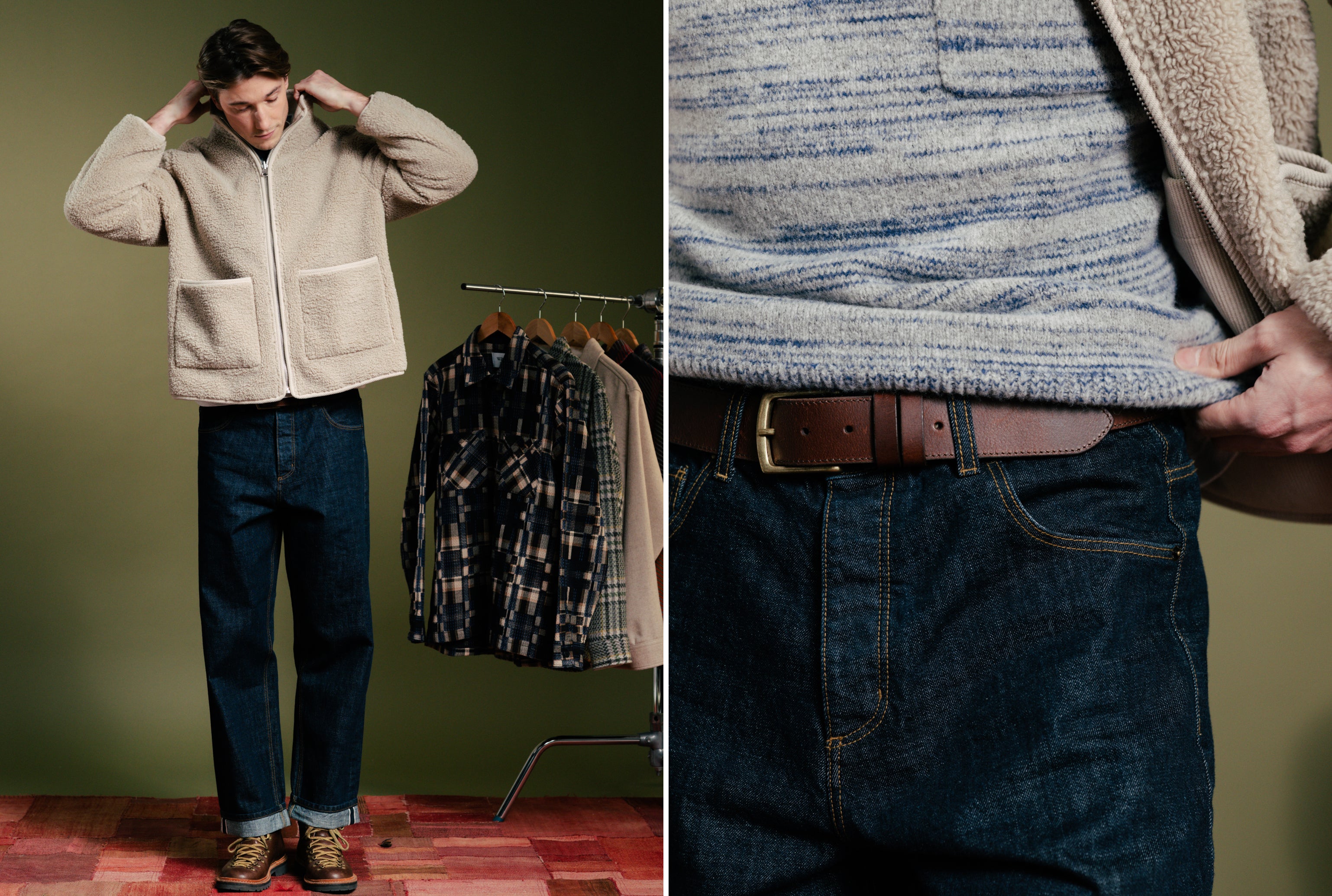 [Right] Harvey wears the Killick - Natural Reversible Corduroy Borg Jacket, Alpha - Grey And Blue Space Dye Zip Polo, Paton - Brown Leather Belt & Felix - Rinse Wash Selvedge Loose Fit Denim Jeans