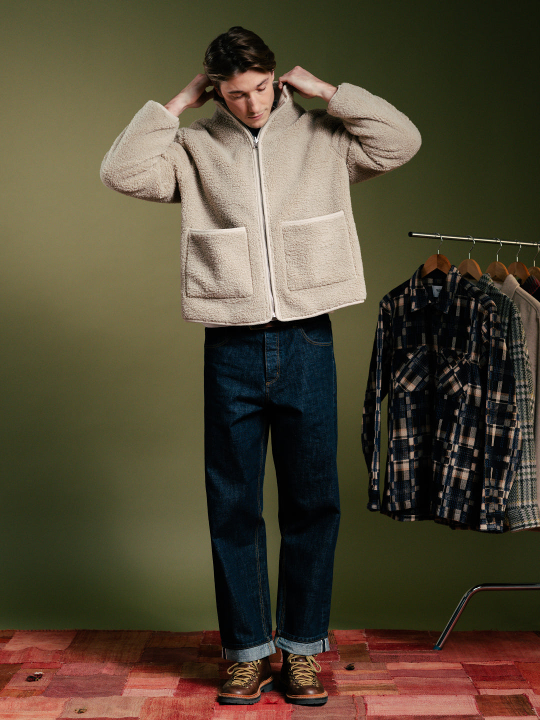 [Left] Harvey wears the Killick - Natural Reversible Corduroy Borg Jacket & Felix - Rinse Wash Selvedge Loose Fit Denim Jeans
