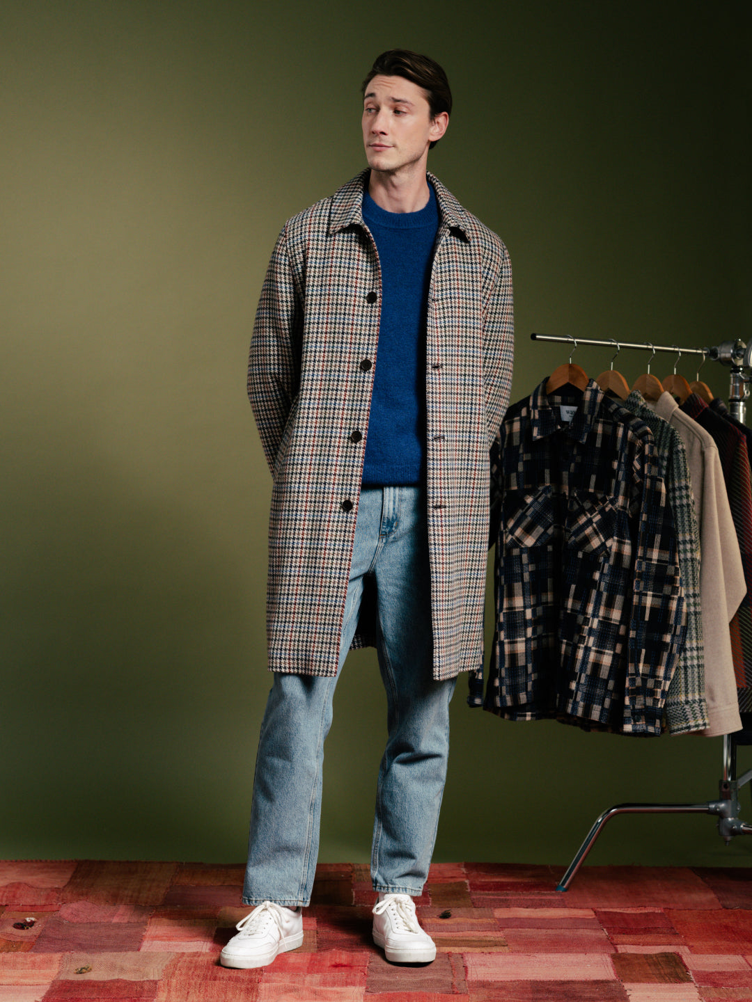 [Left] Harvey wears the Stan - Natural Houndstooth Check Wool Car Coat, Wilde - Blue Fluffy Wool Crewneck, & Russell - Vintage Blue Straight Fit Denim Jeans