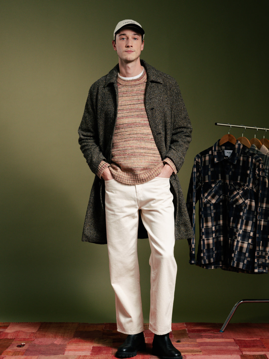 [Middle] Harvey wears the Stan - Brown Fleck Tweed Car Coat, Wilde - Pink And Brown Space Dye Wool Crewneck & Felix - Ecru Loose Fit Denim Jeans