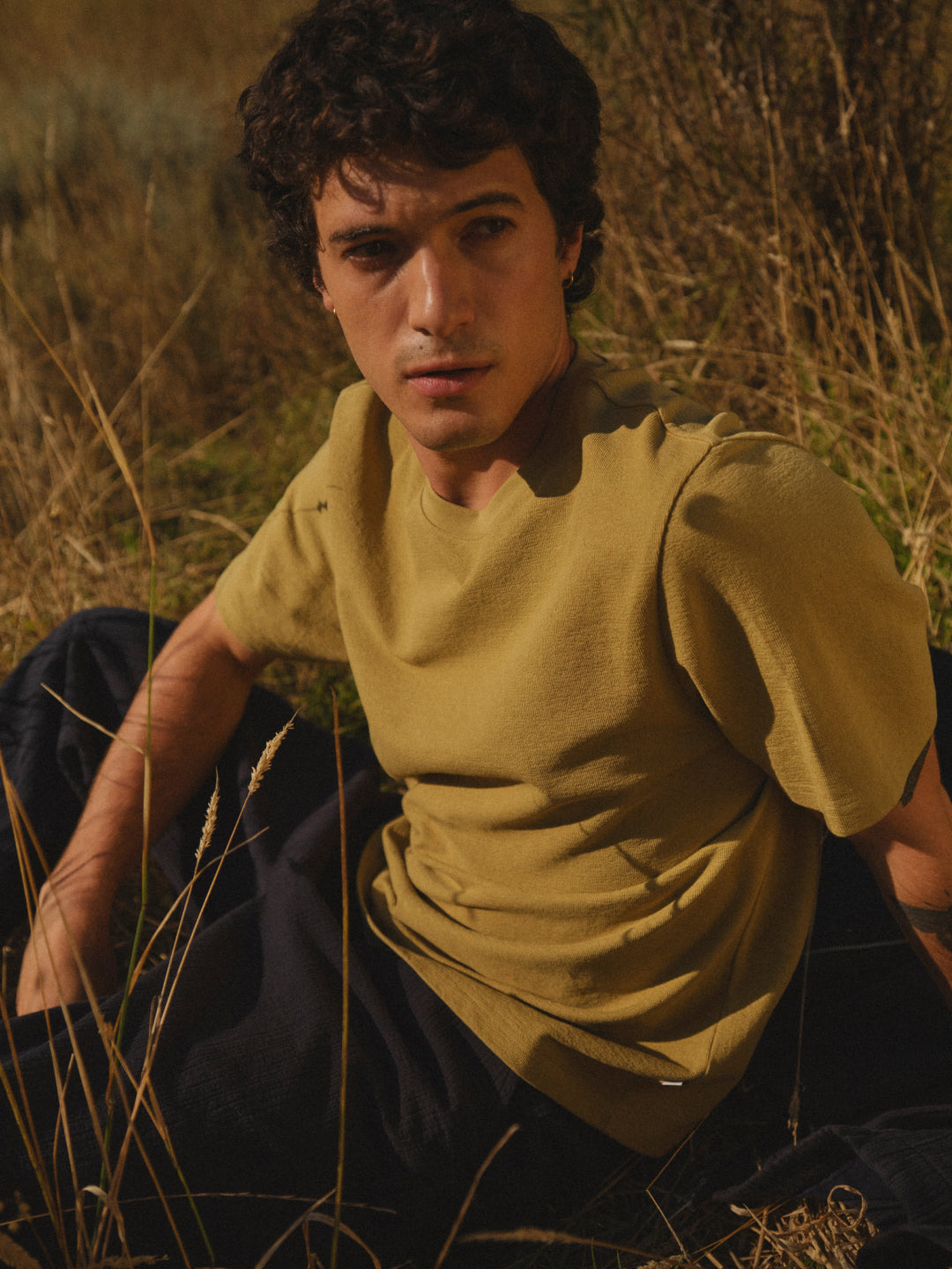 Dom wears the Dean - Dark Green Textured Organic Cotton T-Shirt & the Felix - Ecru Loose Fit Denim Jeans