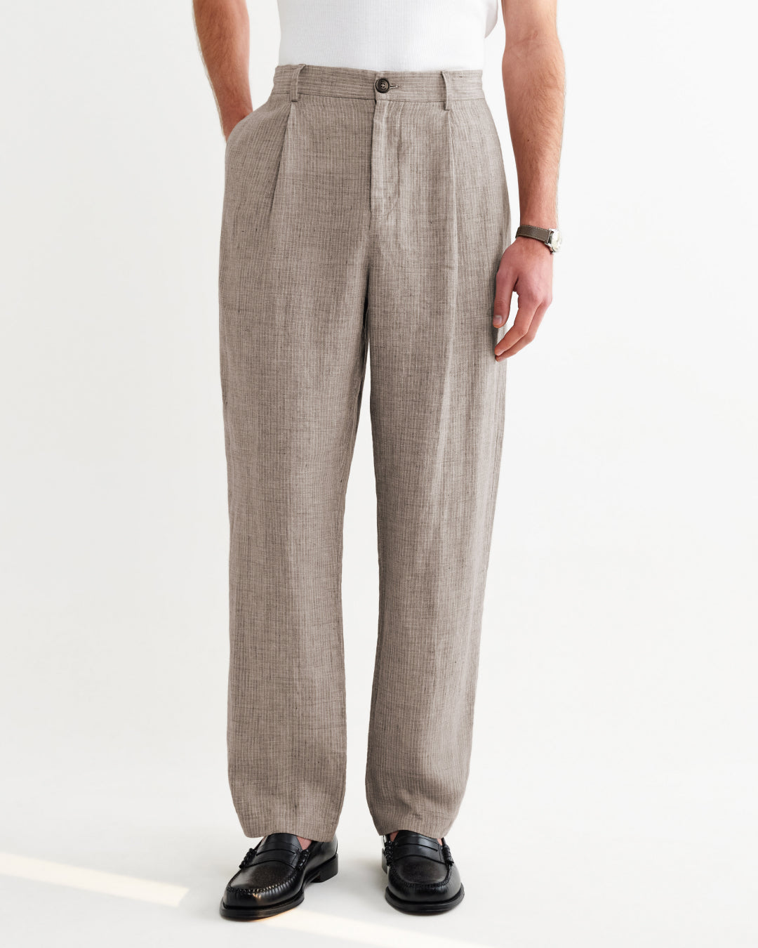 The Aubyn is a smart, versatile silhouette designed to move seamlessly between settings. It’s cut in a relaxed fit with a soft taper towards the ankle, and finished with a signature single front pleat. Available in two fabrications: a 100% linen version that pairs effortlessly with the matching Vigo blazer, and a cotton–tencel blend designed to complete the set with the Strand jacket.