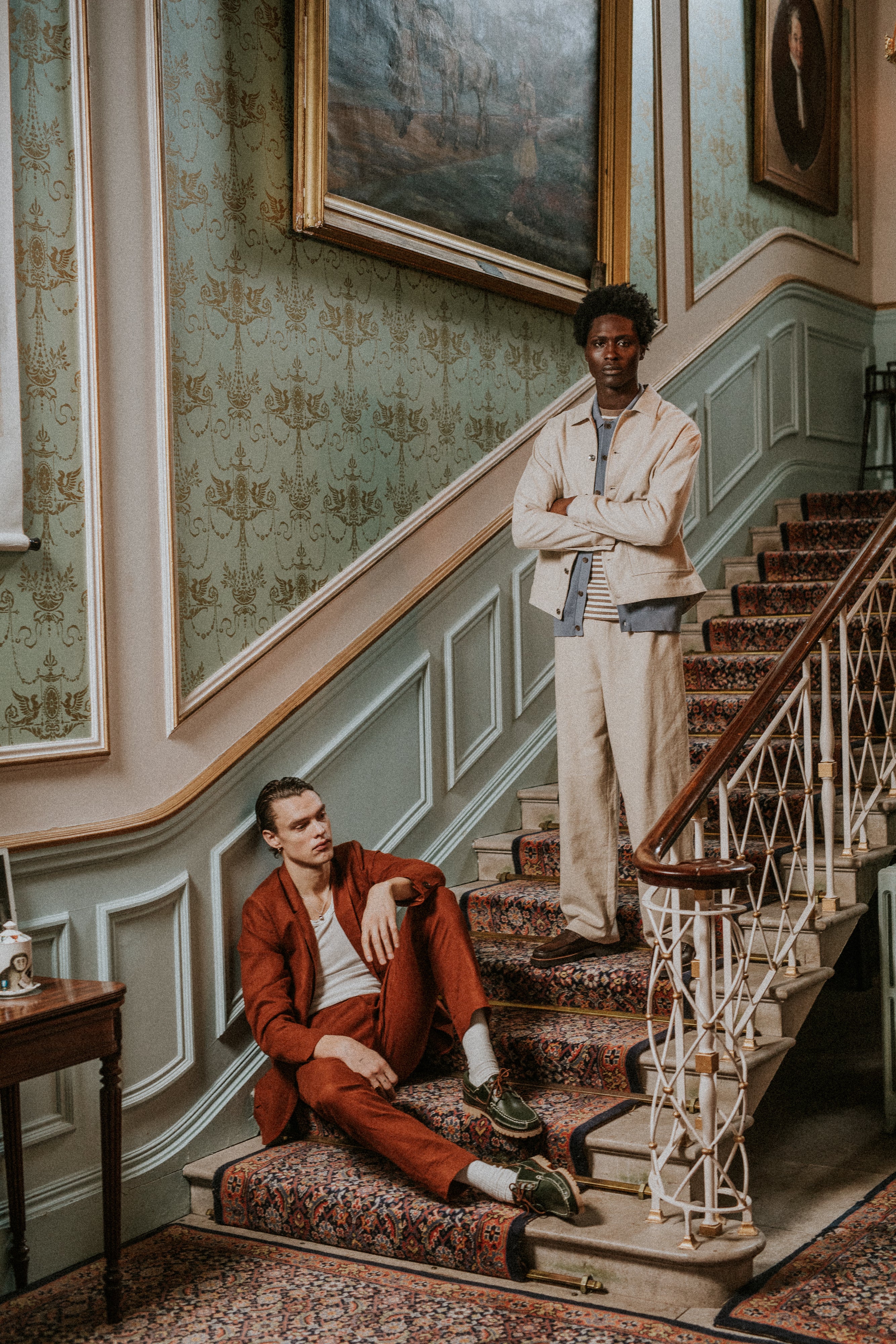 [Left] Fintry Blazer Rust Linen (Coming Soon), Alp Trousers Rust Linen (Coming Soon), Montague Vest White [Right] Mitford Jacket Natural, Tristan Shirt Blue, Dean T-Shirt Textured Walnut/Ecru Stripe, Campbell Trousers Natural