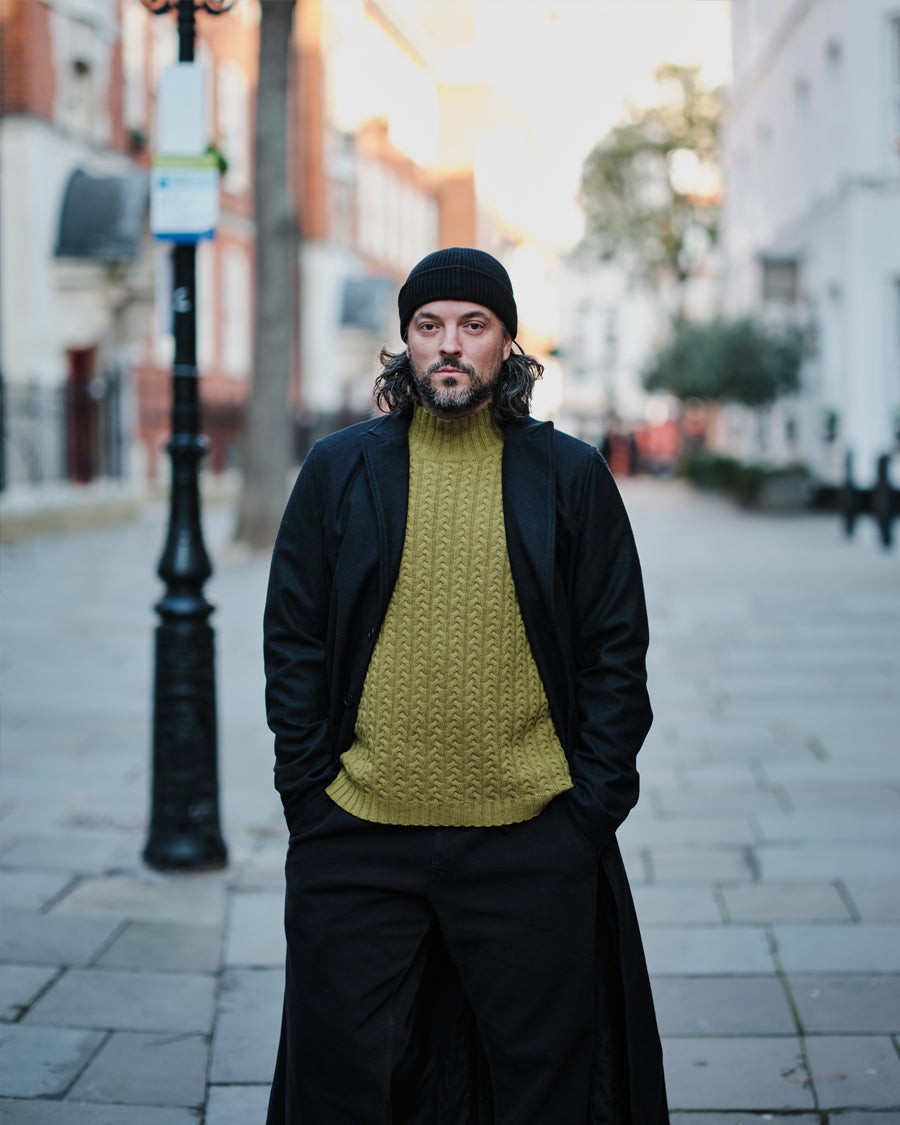 Sam wears Condo Coat Black Melton Wool & Fisherman Beanie Black