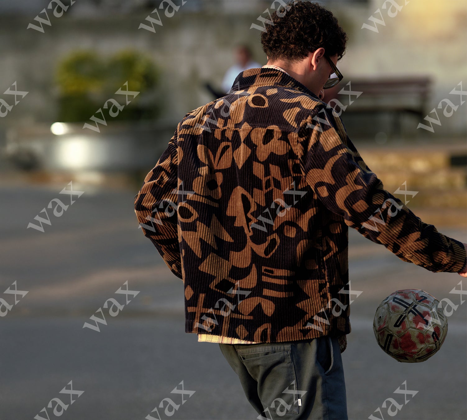 A bold new addition. Regular fit, slightly shorter in the body with side seam pockets and a single patch pocket. Offered in three unique fabrications - khaki jumbo corduroy, black velvet corduroy, and navy cotton jacquard. Three distinct designs, one silhouette.