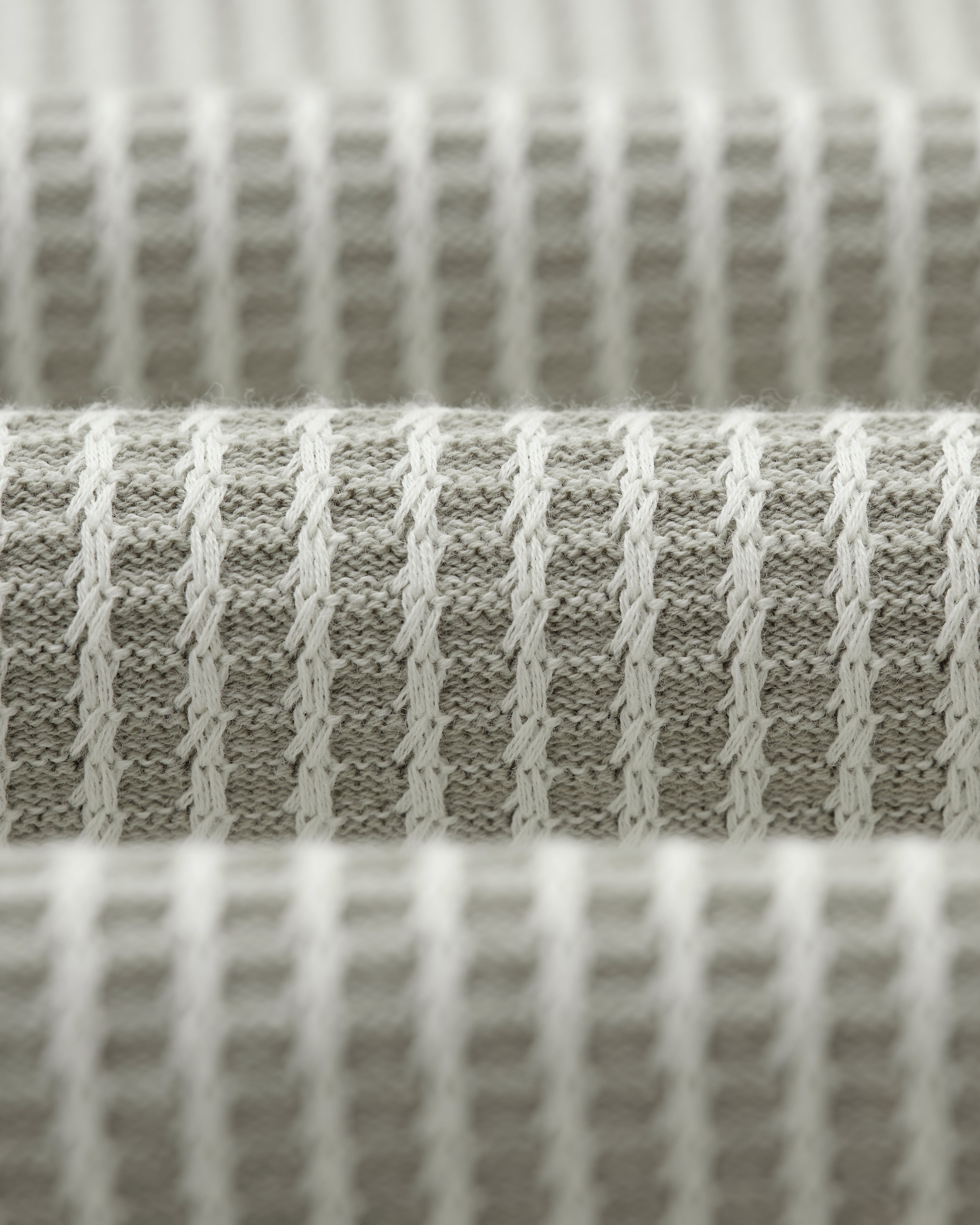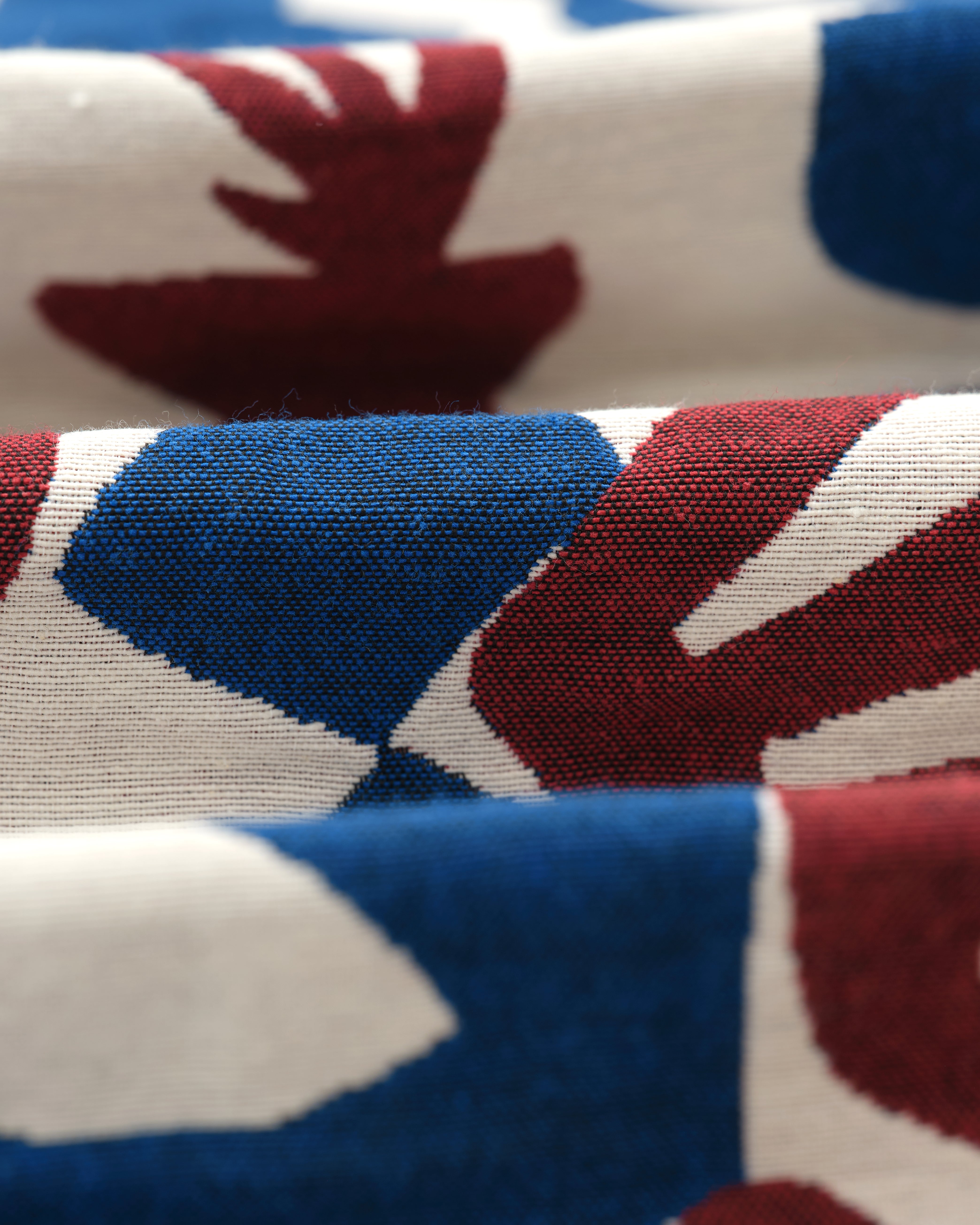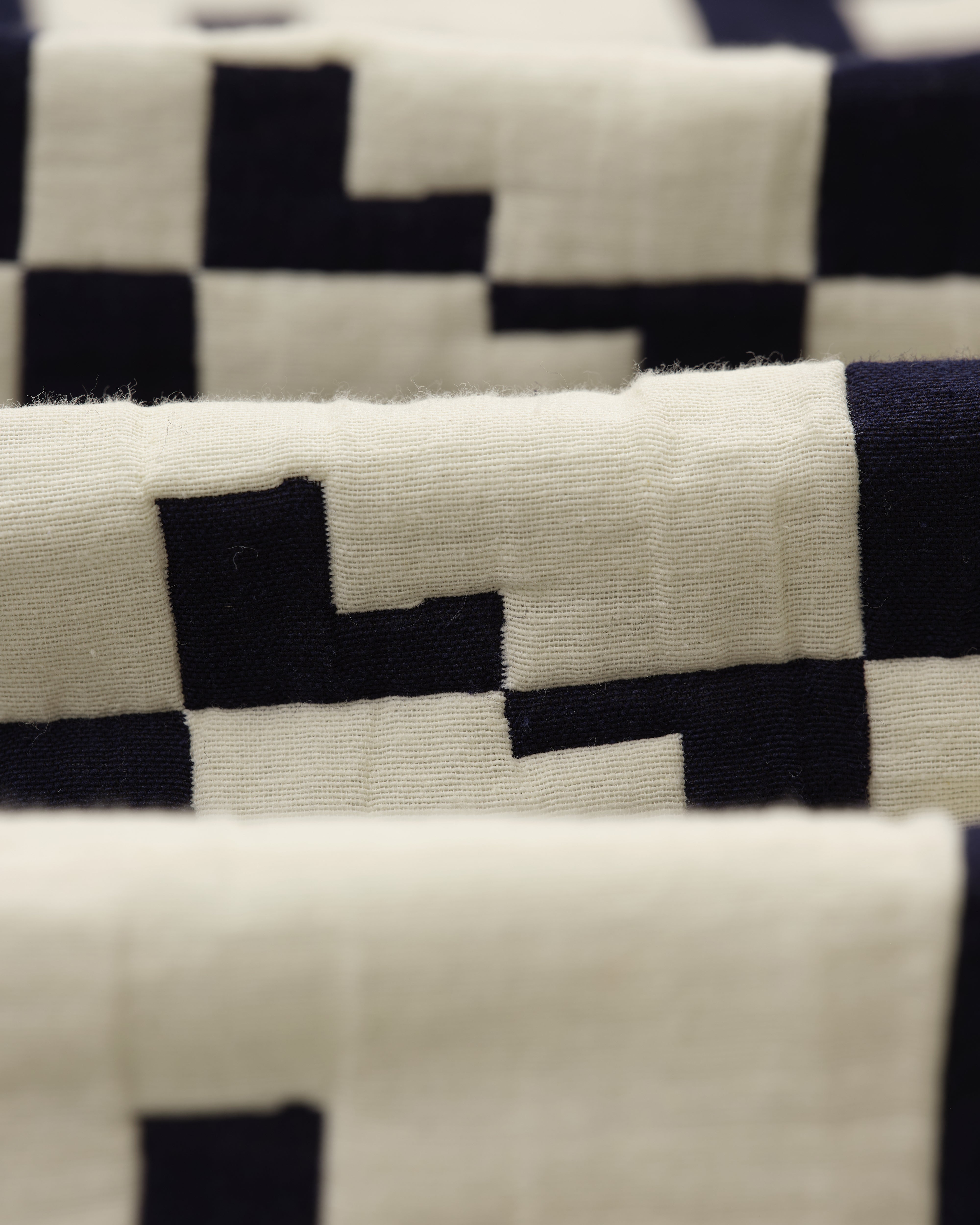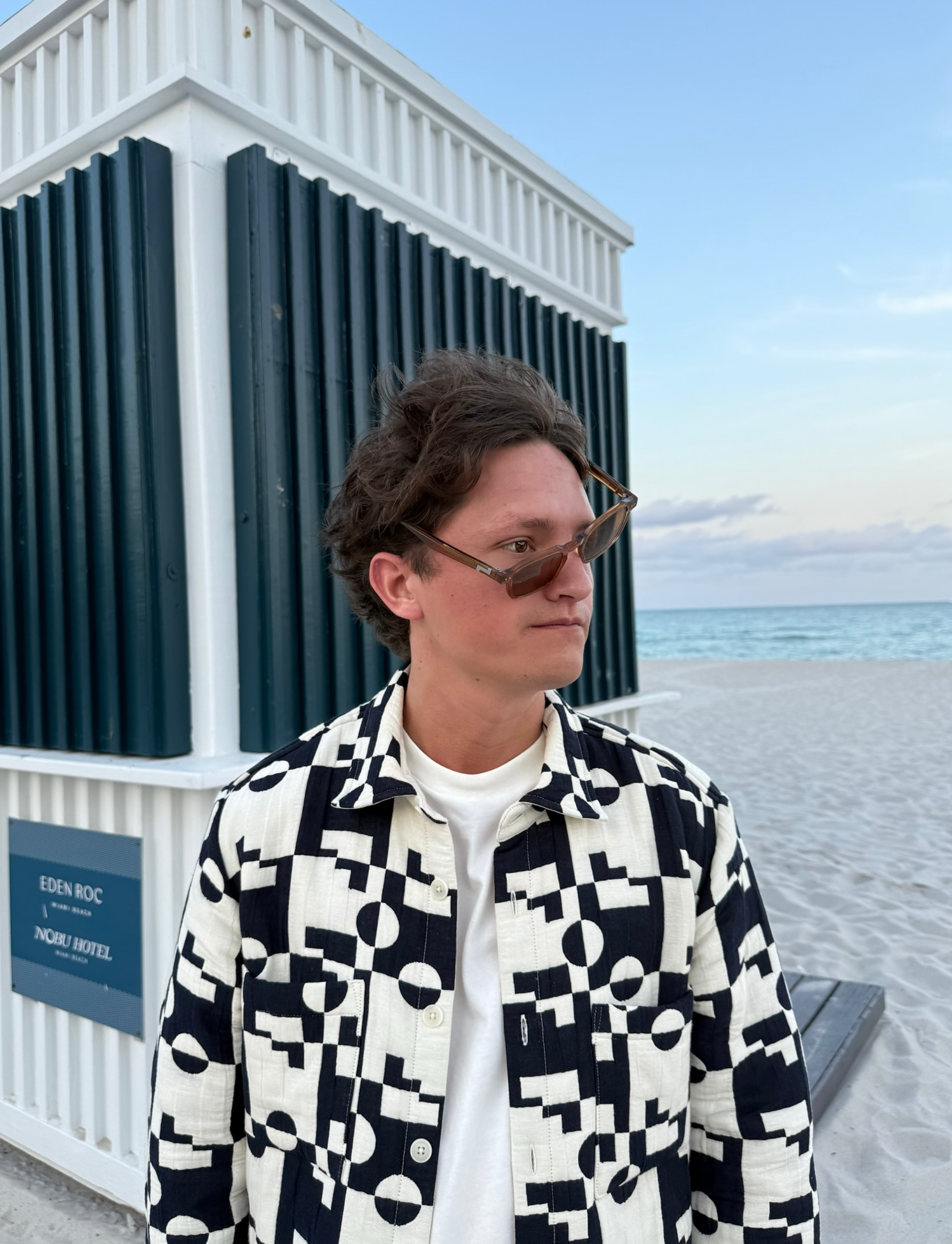 @fibula wears our Otto - Navy And Ecru Jigsaw Jacquard Overshirt and our Dean - Ecru Textured Organic Cotton T-Shirt
