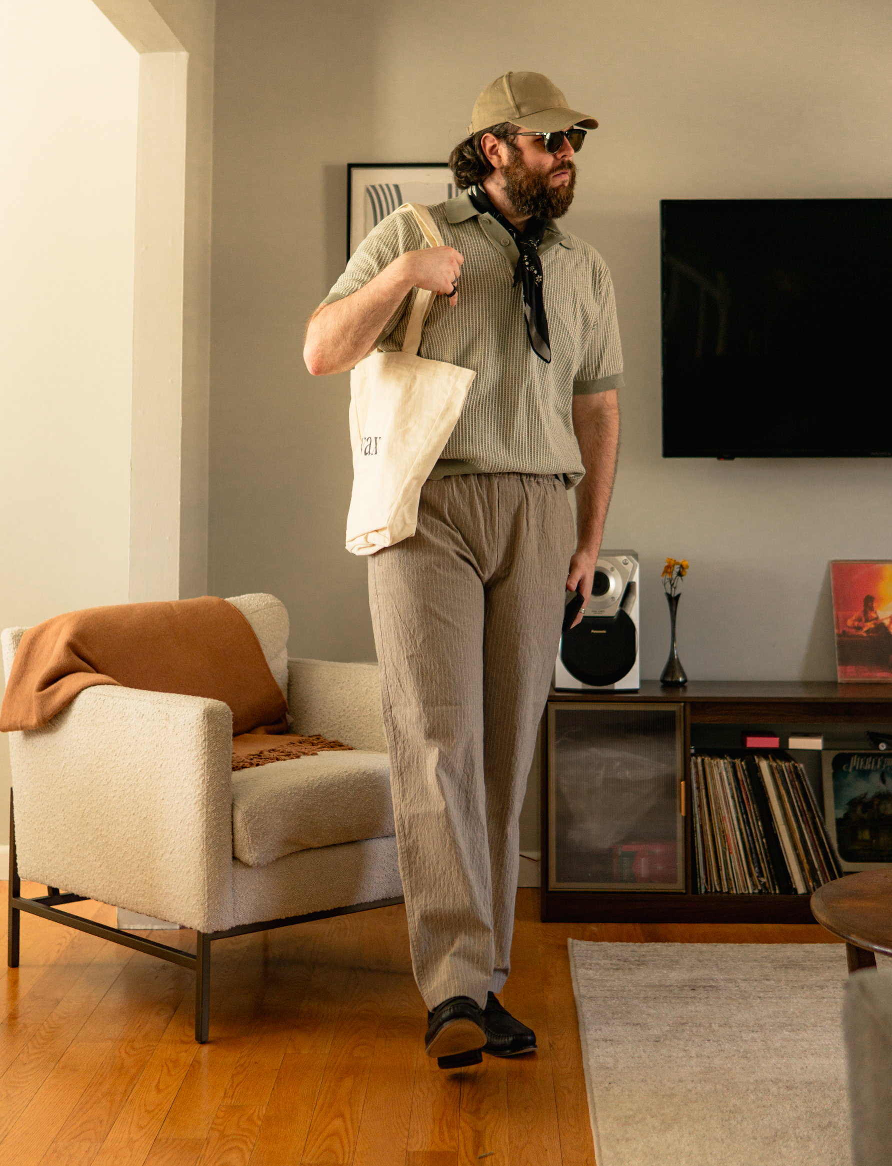 @sad.seymour_3 wears our Turin - Light Khaki Ladder Stripe Knitted Cotton Polo, our Tyne - Natural Chalk Stripe Trousers and our Sloane - Black Floral Neck Scarf