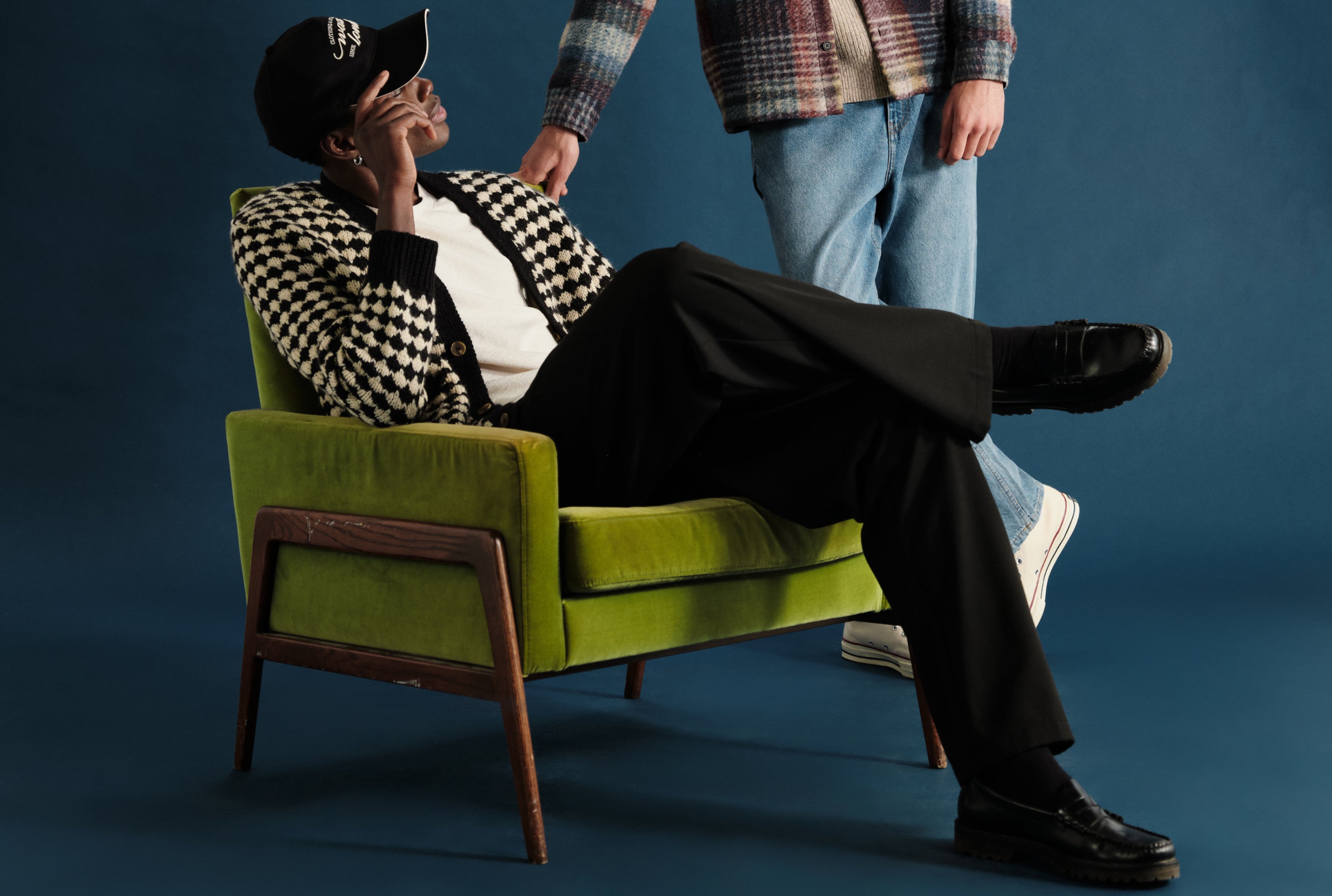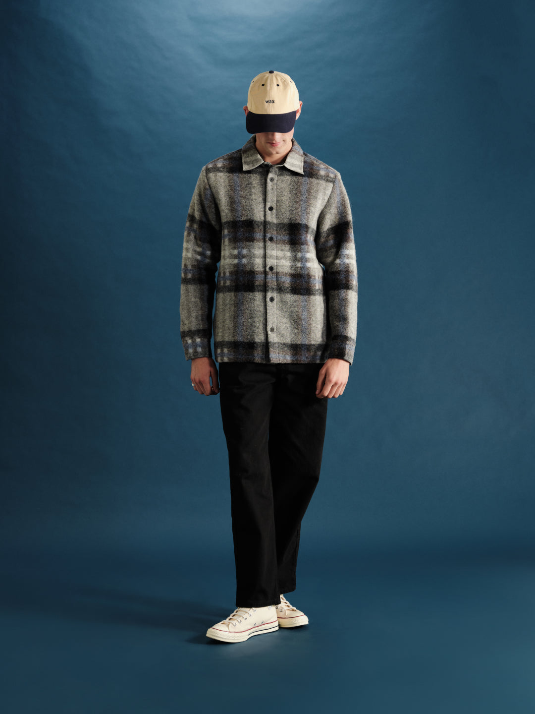[Right] Nolan - Grey And Blue Check Italian Wool Overshirt, Felix - Black Loose Fit Denim Jeans
