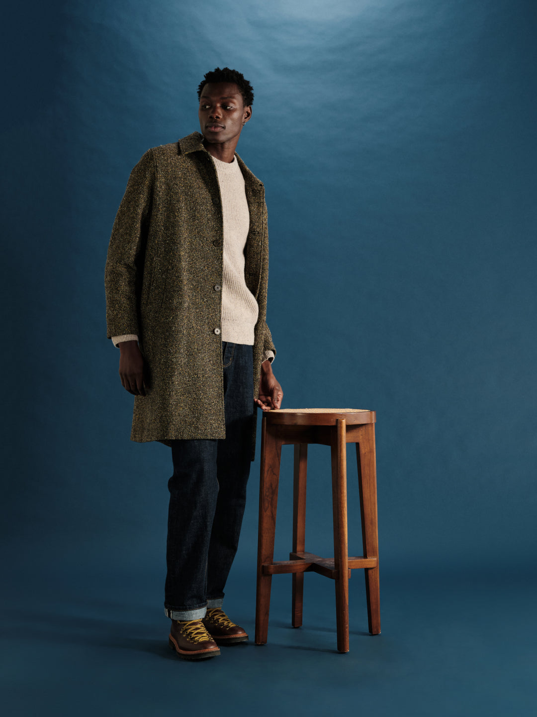 [Middle] Stan - Brown Fleck Italian Tweed Car Coat, Wilde - Natural Donegal Wool Crewneck, Felix - Rinse Wash Selvedge Loose Fit Denim Jeans