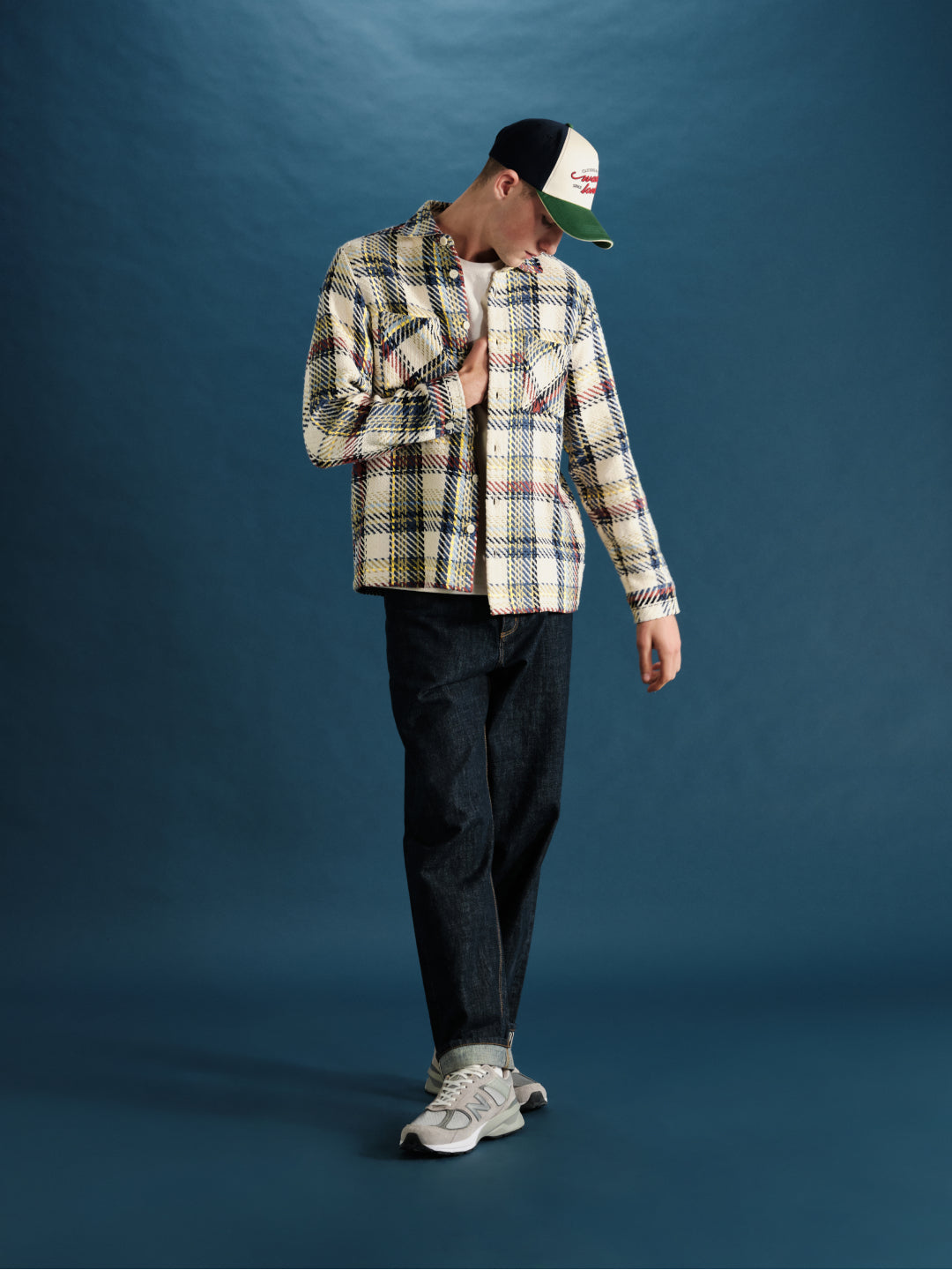 [Left] Whiting - Ecru And Multicolour Jazz Weave Overshirt, Felix - Rinse Wash Selvedge Loose Fit Denim Jeans