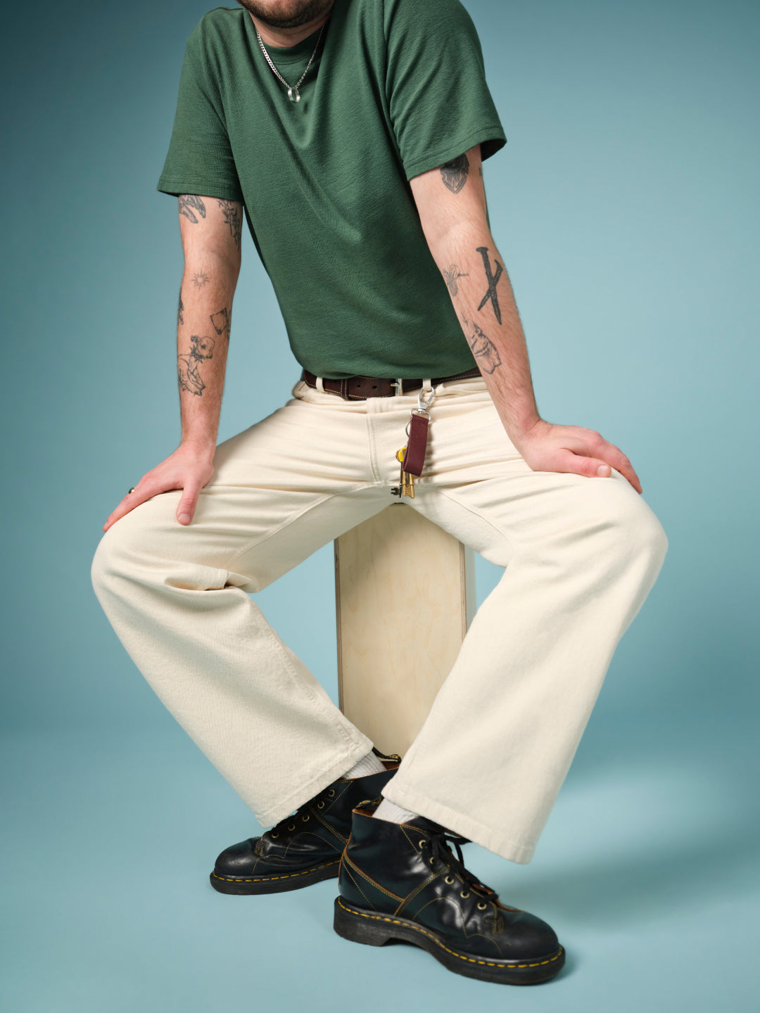 Dom wears the Dean - Dark Green Textured Organic Cotton T-Shirt & the Felix - Ecru Loose Fit Denim Jeans