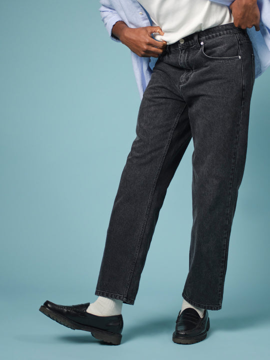 [Right] Calvin wears the Russell - Washed Black Straight Fit Denim Jeans