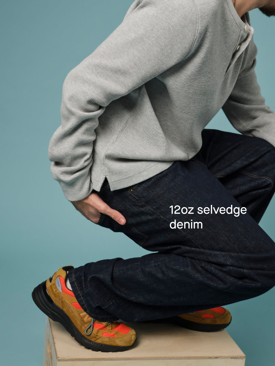 Selvedge denim begins on traditional shuttle looms, where fabric is woven with care, patience, and precision. The result is a clean, finished edge - a hallmark detail best seen with a turn-up at the hem. Built tougher by nature, it takes its time to wear in, fading gradually with movement, use, and age. It’s denim that tells your story. An investment in character that only gets better the longer you live in it.