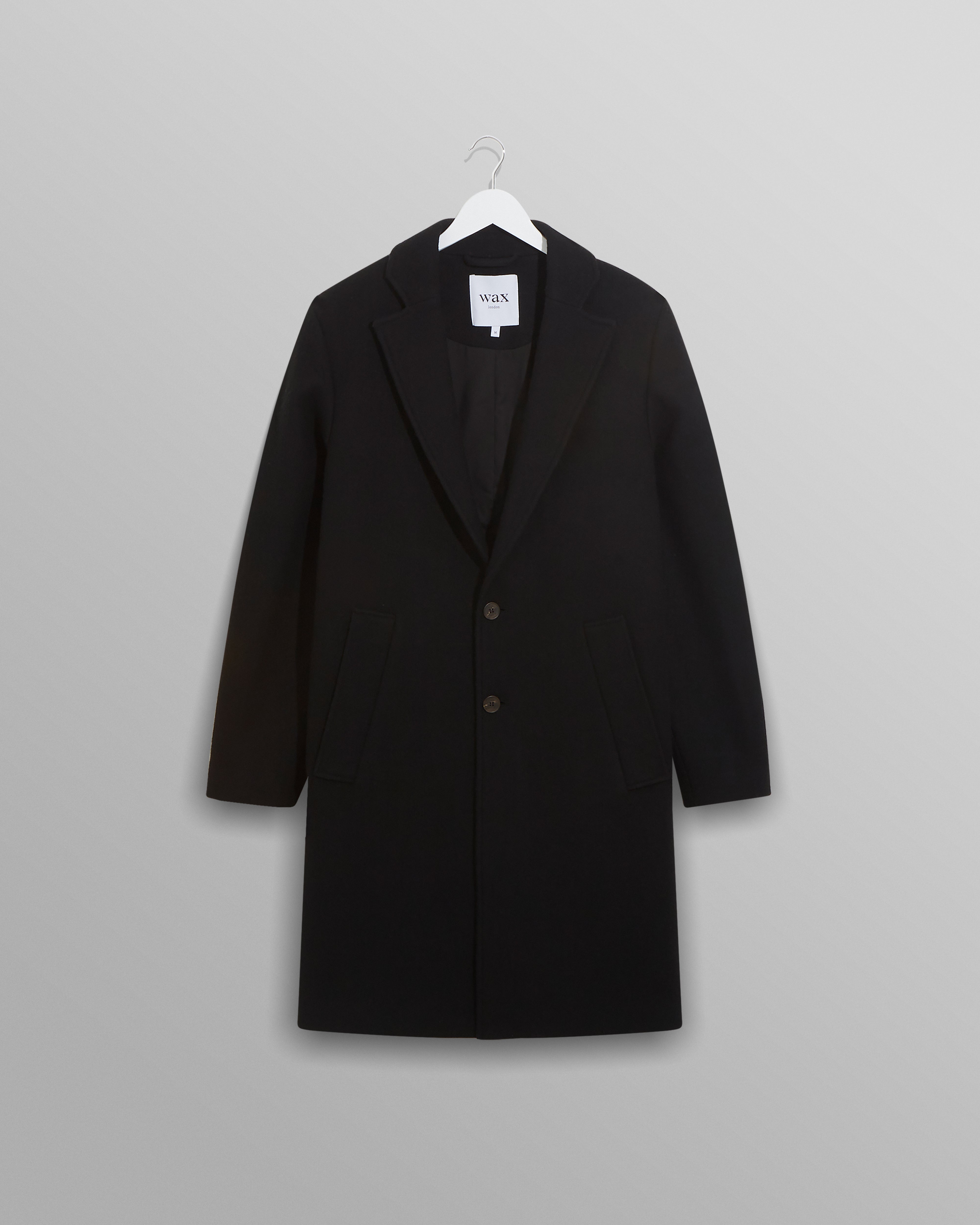 The Sasso Coat is a classic cold-weather style, constructed in a black wool blend. This single breasted coat is cut perfectly for a slightly relaxed fit.